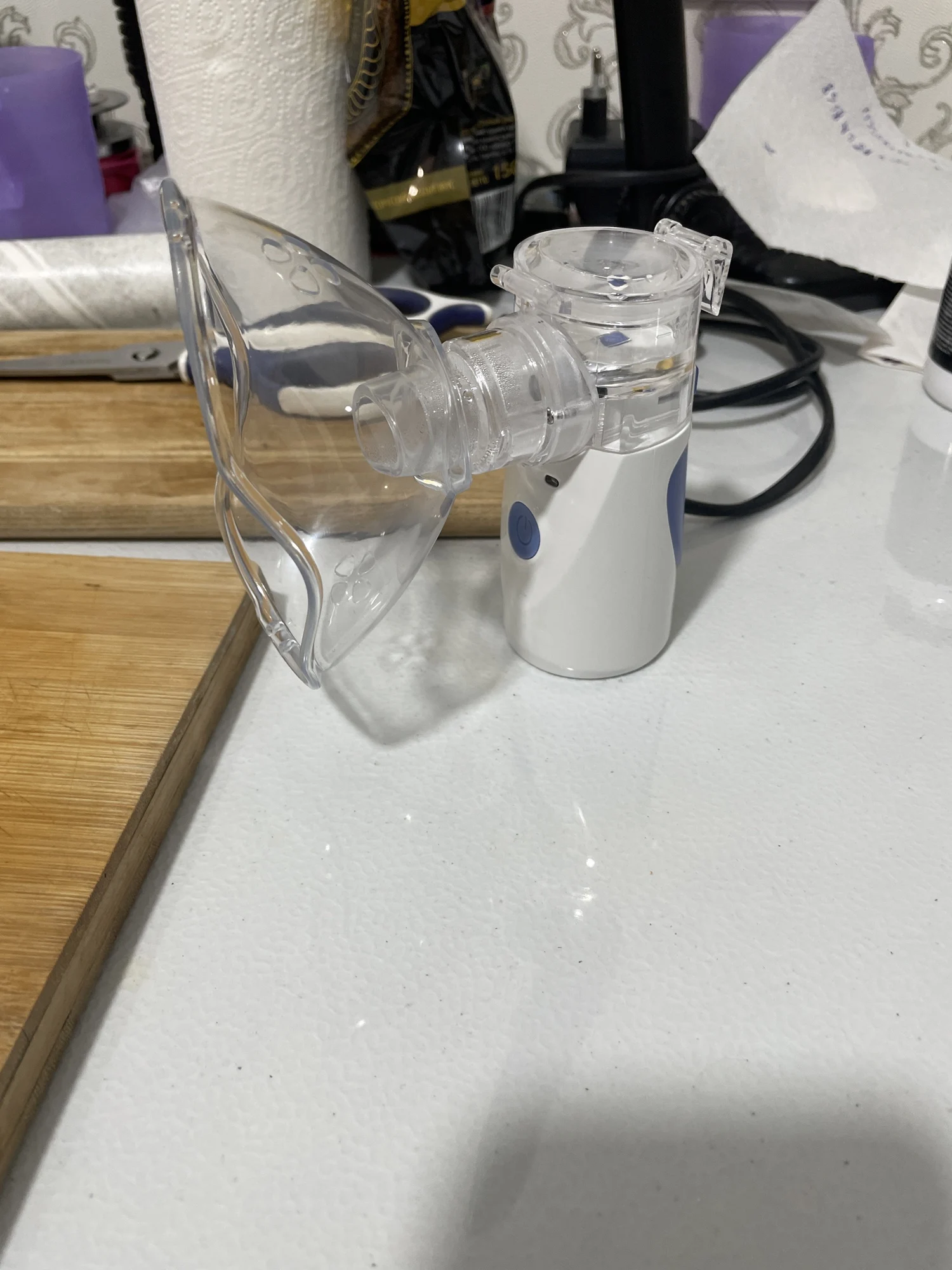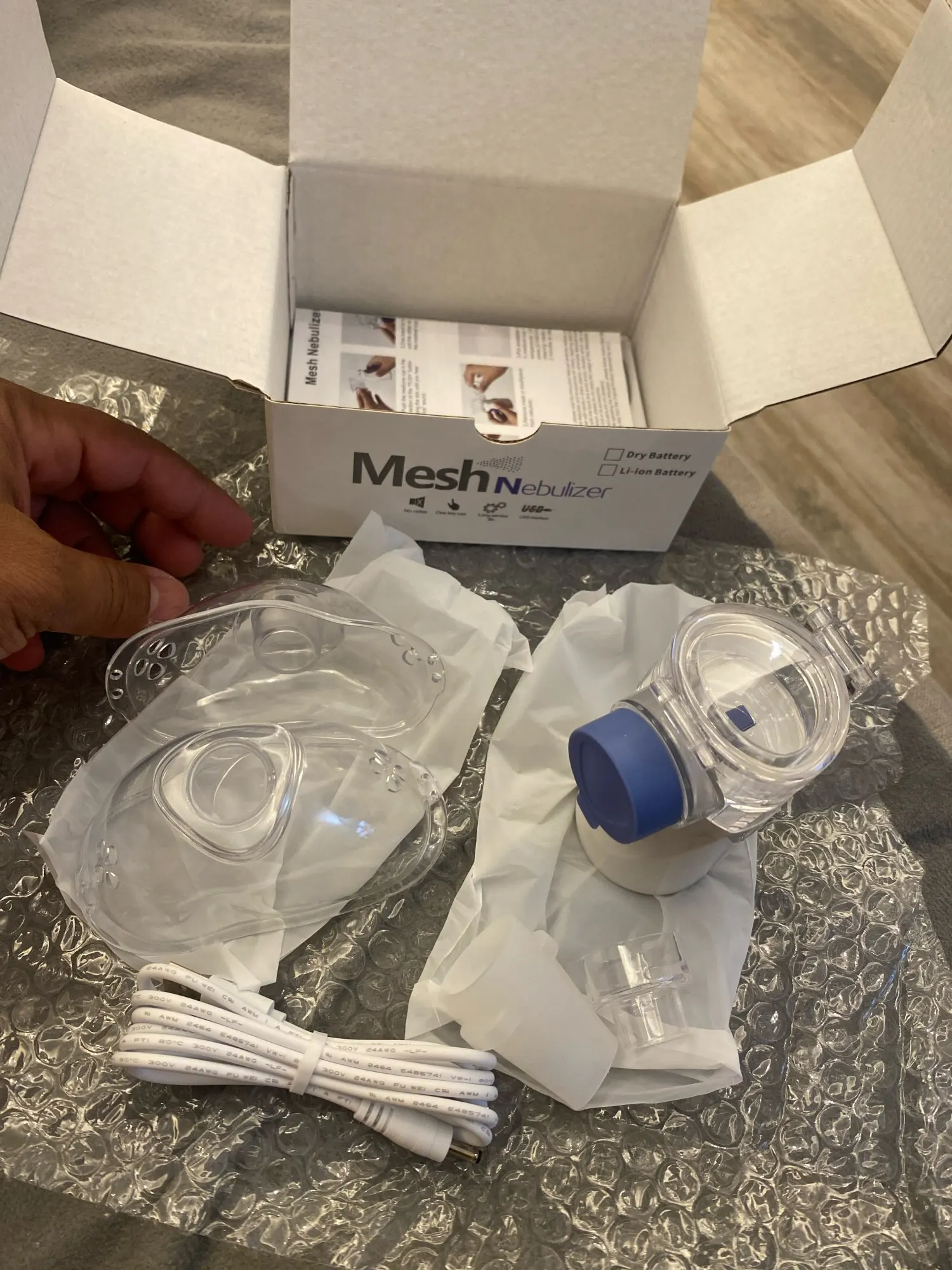 Small handy nebulizer for babies and adults, comes with 2 mask sizes works with batteries and USB wire.